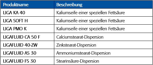 Im Bereich der Oleochemie kommen insbesondere Metallseifendispersionen, Alkaliseifenlösungen und Fettsäuresuspensionen zum Einsatz. Diese Systeme vereinen hydrophobe Eigenschaften mit einer verflüssigenden Wirkung, die zur Reduktion der Kapillarstruktur führt. Dadurch sind die folgenden Produkte optimal für diesen anspruchsvollen Anwendungsbereich geeignet: